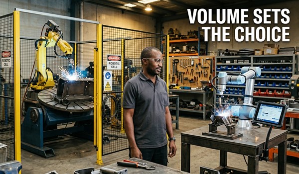 - Decision shortcut: If your operation welds 50+ identical parts per shift on mild steel, choose a robotic welder. If batch sizes are under 20 and changeovers happen daily, a cobot welder delivers faster ROI.